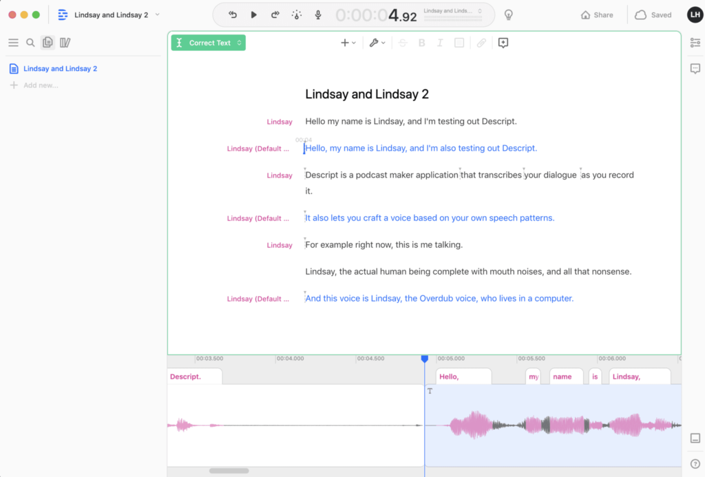 Overdub is the feature that makes Descript seem like sorcery. You can copy and paste a text document into the editor, select an Overdub stock voice, and voilà, instant dialogue.