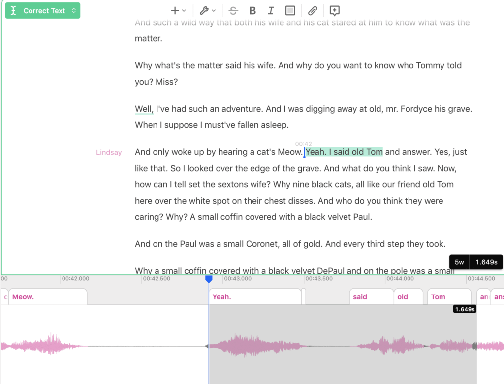 Essentially, you edit your audio in Descript the same way that you would edit a document. Along with this, you can see the waveforms and tracks at the bottom of the screen.