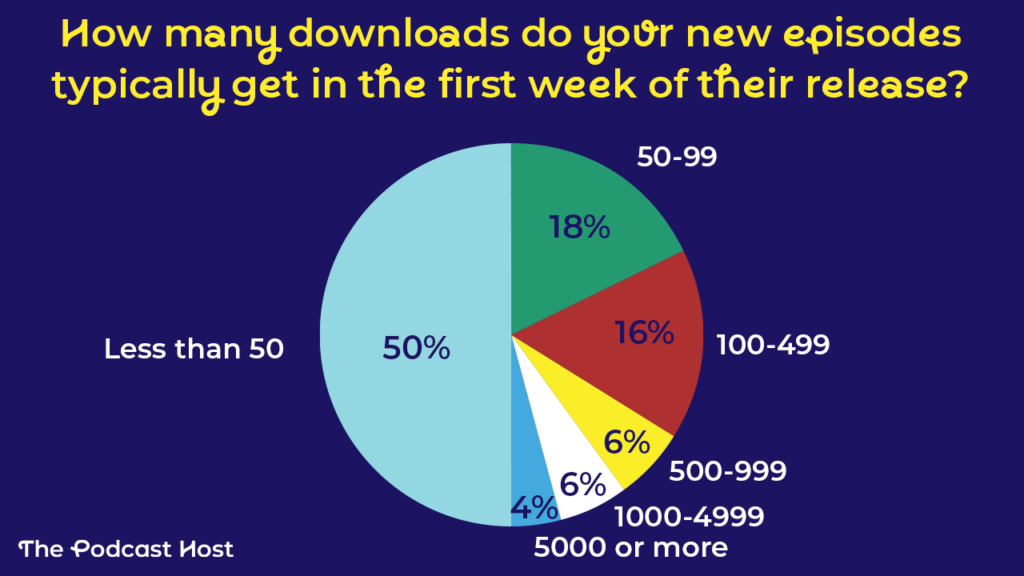 Our own survey of over 500 independent podcasters backs up Buzzsprout’s data. 50% of those we spoke to said their new episodes get fewer than 50 downloads in the first week.