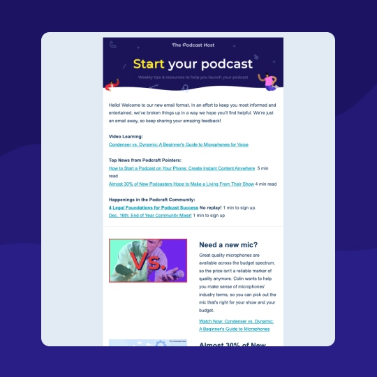 Every week we'll send you a roundup of resources tailored to your stage as a podcaster: pre-launch and post-launch.